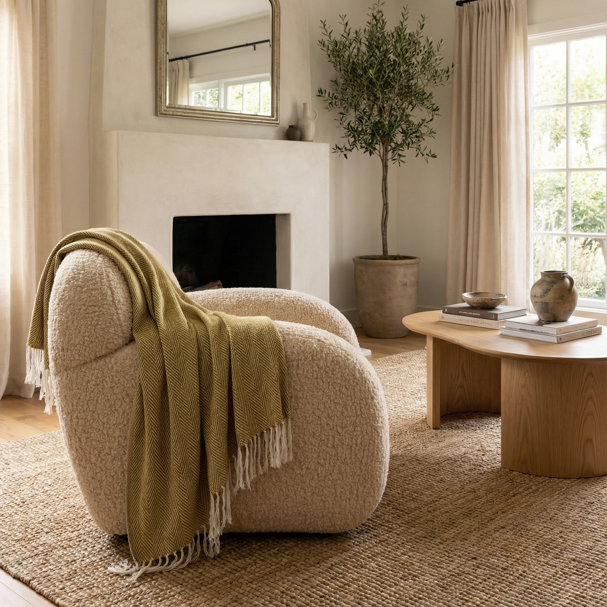 Modern living space with the Luxe Bamboo Stripe Throw in Fern & Forest, draped over soft neutrals—lush green tones anchoring the room in quiet elegance